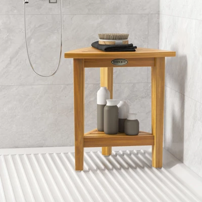 Transform your shower routine with our corner shower stool!Crafted from Indonesian teak, the bath stool infuses your bathroom with a touch of the outdoors and boasts resilience against humidity. The slatted design ensures speedy water runoff, keeping your shower space pristine. At a cozy 17″ x 16″ x 18″ (L x W x H), this compact stool fits snugly into any bathroom nook, making it a go-to seating solution for those with limited mobility or anyone who simply wants to sit and relax while showering, while its 2-tier storage space easily accommodates your bathroom essentials. Plus, it also doubles as a versatile step stool, spa stool, or even a outdoor side table, adding charm and functionality wherever you wish!